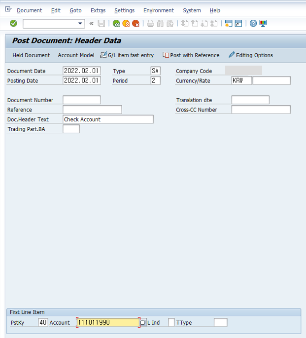 당좌예금(Check Account) 계정과목을 "111011990"으로 생성합니다.