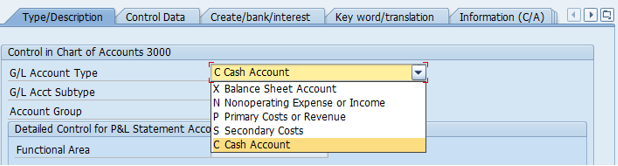 G/L Account Type 은 "C : Cash Account"를 선택합니다.