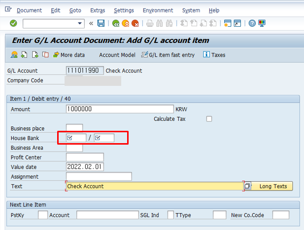 아래와 같이 전표 생성 시에 House Bank, Account ID 가 Required Field 로 설정됩니다.