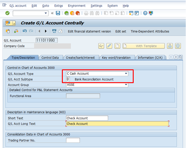G/L Account Type 은 "C : Cash Account" 를 입력하고요