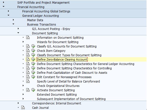 IMG >Financial Accounting > General Ledger Accounting > Business transactions > Document Splitting > Define Zero-Balance Clearing Account