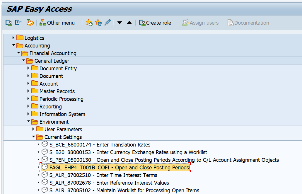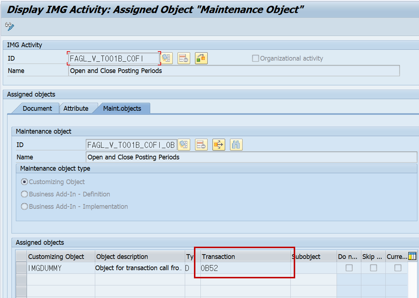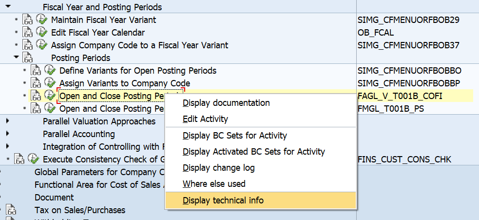 Open and Close Posting Periods 를 선택하고, 마우스 오른쪽 버튼을 클릭한 후 "Display technical Info"을 선택한다.