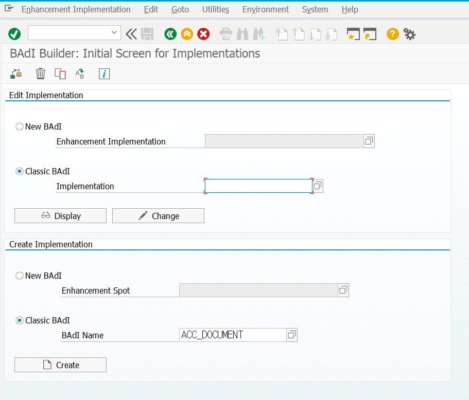 T-code : SE19 에 가서 Classic BAdi 에 이름을 입력하고 Create 한다.