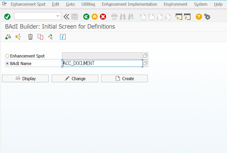 T-code : SE18 에서 BAdi Name 에 "ACC_DOCUMENT"를 입력하고 조회한다.