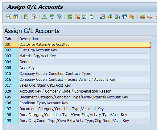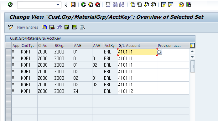 001 Tab 을 선택하면 하기와 같이 Condition Type/CoA/Sales Org./AAG/AAG/Actky/GL Account/Provision acc. 순으로 정의하게 되어 있습니다.