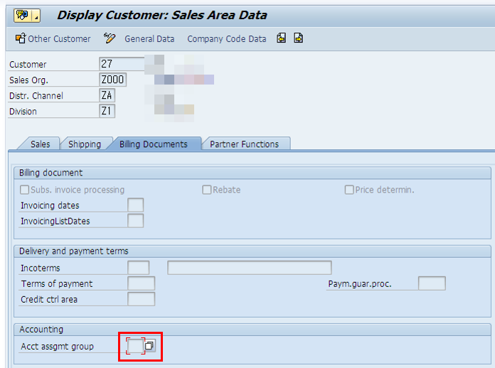 Customer Master 의 Sales View 를 보면 Billing Documents Tab 에 Acct assgment group 을 지정하도록